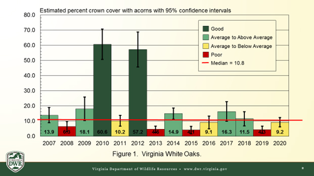 读者应该知道,桅杆丰度评级旨在反映区域平均值,但整个地区的桅杆作物并不统一。橡子丰度在相距仅10 - 15英里的局部区域之间会有所不同。有趣的是,该州某些地区的橡子产量(尤其是白橡木)似乎高于平均水平。今年秋天,无论是否携带武器,侦察兵都将再次证明对弗吉尼亚人户外活动的帮助,他们可以去欣赏野生动物,甚至可能猎获一只鹿、熊或野生火鸡。