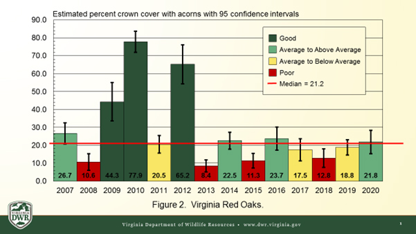2020似乎没有什么事情是正常的,但其中之一就是弗吉尼亚州的橡子生产!我们的调查显示,白橡树和红橡树的橡子产量都接近2020的长期中值。DWR 工作人员以及众多合作组织和志愿者在2020在英联邦各地共抽样了31调查地点。