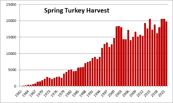 野生动物资源部 (DWR) 宣布在2022春季火鸡季节将收获19 、 711火鸡。这是有记录以来春季火鸡产量第四高的年份,前三个最高产量年份分别是2015 、 2021和2020 。DWR 执行董事 Ryan Brown 表示:“弗吉尼亚州的春季火鸡季节继续为人们提供与大自然、家人和朋友联系的激动人心的机会,同时帮助保护该州的野生动物资源。”