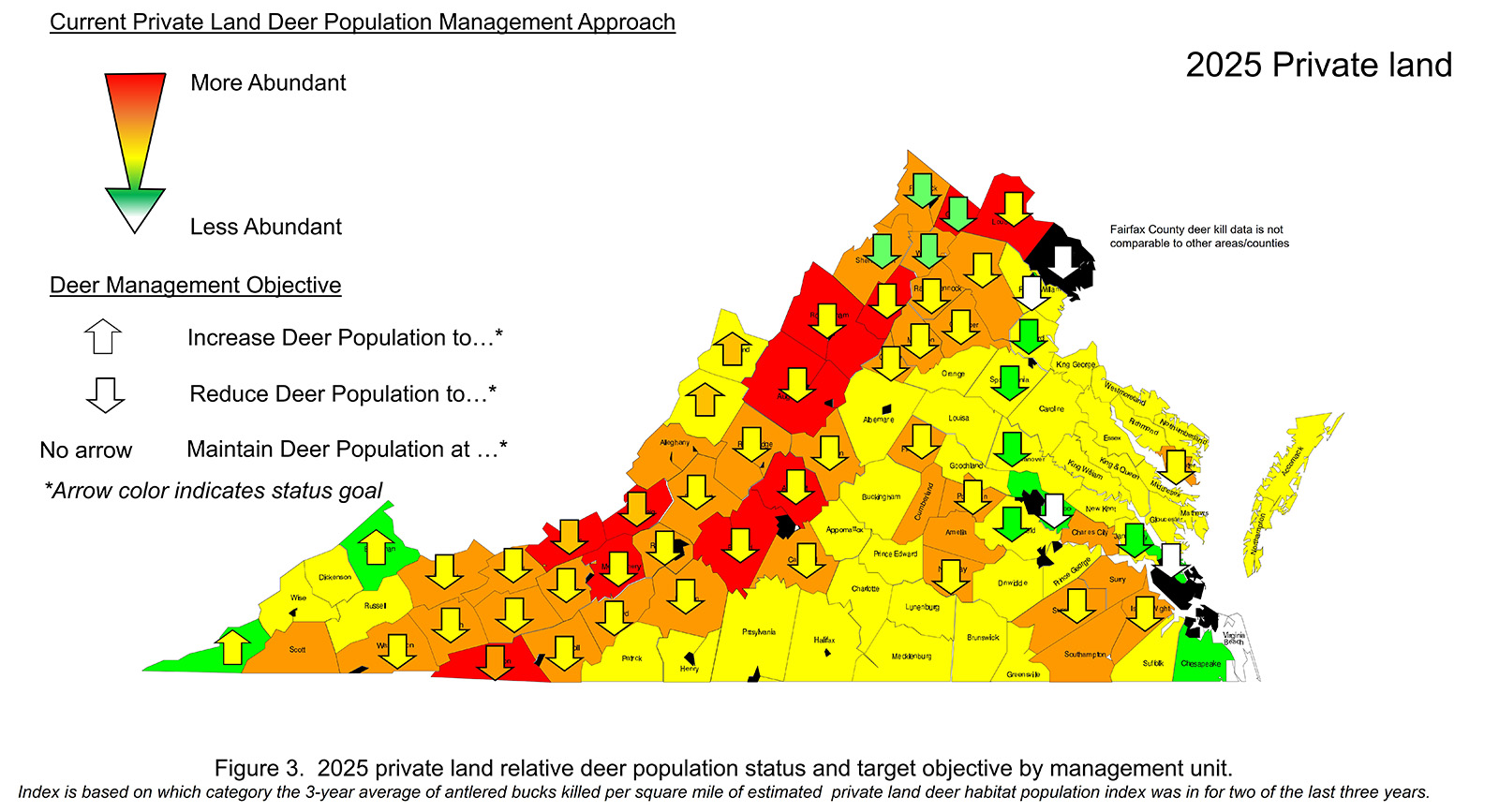 比较Virginia州鹿群数量的最佳方法是根据估计的鹿栖息地每平方英里的雄鹿数量来计算。这是我们用来监测鹿群数量随时间变化趋势的人口指数。图3显示了过去三个狩猎季节平均各县私人土地上每平方英里栖息地猎杀的雄鹿数量的相对差异。请注意,Virginia州有97主要的鹿管理单位。