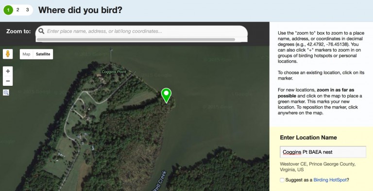您可以通过单击选择一个红点或蓝点作为您的位置,但前提是它准确地代表了您观鸟的位置。如果您选择现有位置,请注意阻塞线。许多热点都非常靠近街区交叉口,因此必须将目击事件定位到正确的街区。在许多情况下,您将输入一个代表您所覆盖的街区内的路线的点,在这种情况下,您需要绘制您所去过的地方中间的点。在未来的教程中,我们将讨论如何将多个清单放在一个块中,但现在我们只需绘制出沿河发现鹰巢的点。单击地图来绘制代表您看到鸟类的位置。