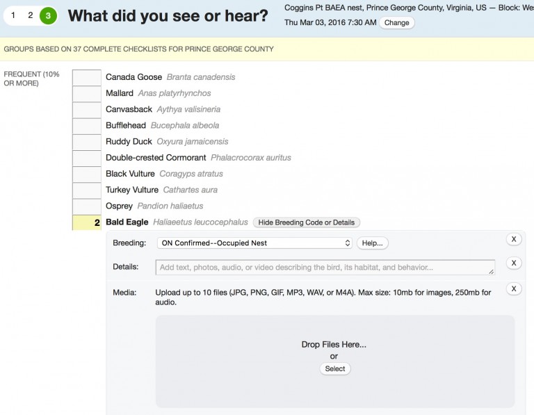 因此,当您输入了繁殖代码为 ON – Occupied Nest 的2白头鹰,并在“详细信息”字段中输入了您想要的任何评论(您也可以使用此字段嵌入照片)后,还有最后一件事要做。您必须回答右下角的问题:“您是否提交了所有您能识别的鸟类的完整清单?”。在这种情况下,我们仅提交了鹰,并没有注意到该地区可能存在的白头翁、苍鹭或其他鸟类,因此我们将单击“否”(无论如何,这是偶然检查表上的默认设置)。