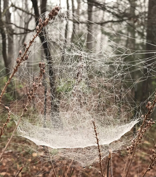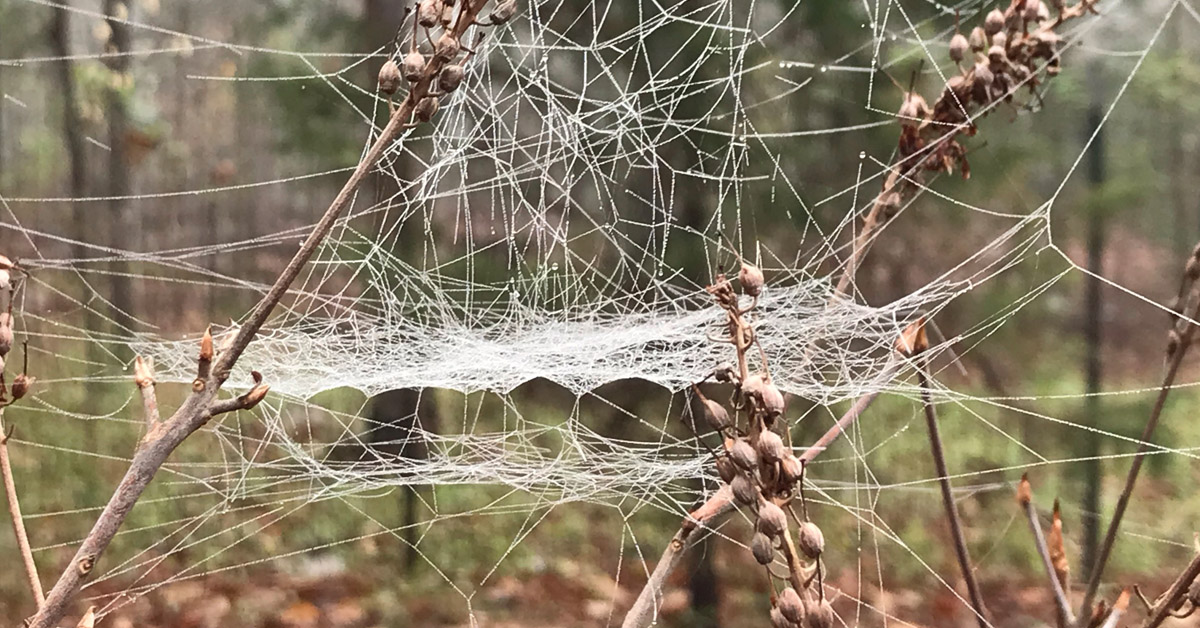 我感觉自己就像桃乐丝在奥兹国打开了一扇门,因为我一走出去,就看到昨晚雨中升起的薄雾勾勒出数百张小蜘蛛网的轮廓。