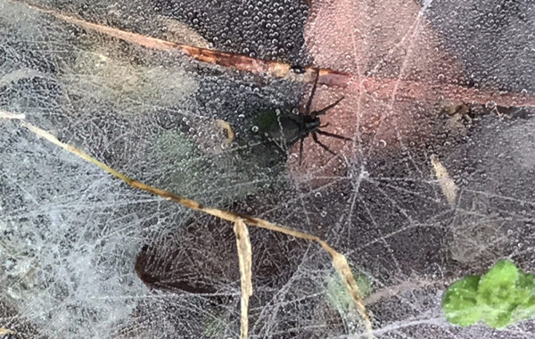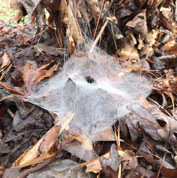 一些蛛网在地上,藏在去年秋天我有意没有耙起的干树叶之中,因为落叶对于许多野生动物物种来说是极其重要的栖息地。叶子为漏斗织网蜘蛛提供了结构。你可以看到每张网都有一个小孔,蜘蛛就藏在那里等待,随时准备应对可能出现的昆虫的轻微震动,而这些昆虫可能会成为今天早上的早餐。你知道,蜘蛛也要吃东西。