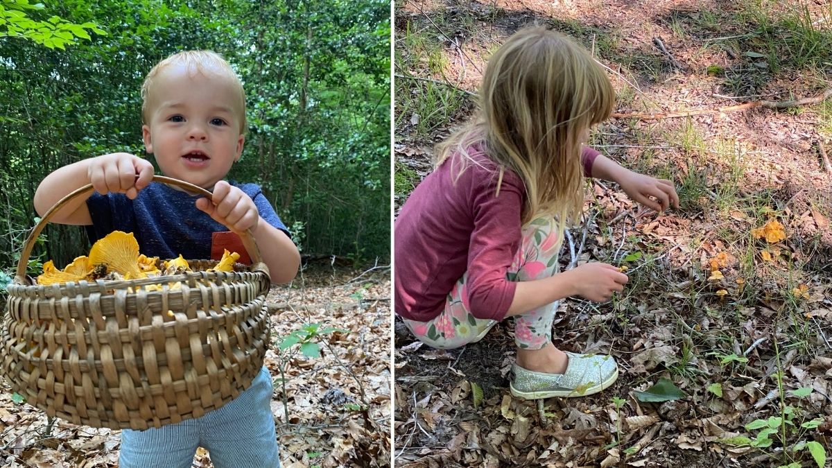 作者的儿子和女儿在自家的土地上采蘑菇。