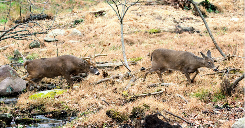 白尾鹿发情高峰是由光周期时间引起的,光周期是指每年 11 月任何一天24小时的日照量。猎人们希望在这段时间看到成年雄鹿追逐雌鹿并保卫自己的活动范围。然而,在一月份观察到这种攻击性行为是非常不寻常的。摄影:Leonard Lee Rue III 博士