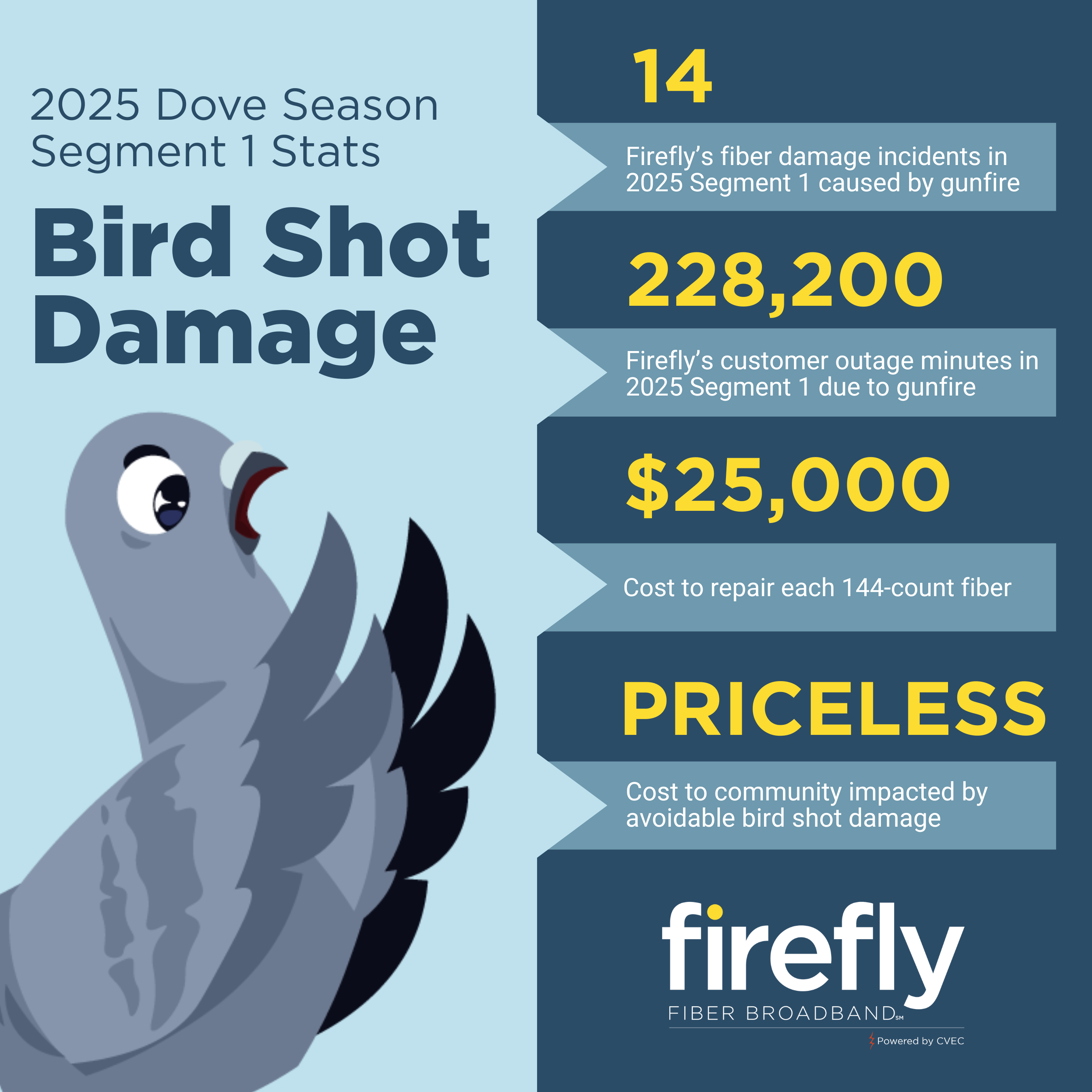 向电线开枪属于联邦犯罪行为。此外,损坏的修复费用高昂,还会导致附近的家庭和企业的网络和电话中断。"Firefly 公司首席执行官兼总裁加里-伍德(Gary Wood)说:"在鸽子狩猎季节损坏光纤对 Firefly 公司、宽带提供商和当地猎人来说都是一个新现象。"这些人多年来一直在同一片土地上打猎,很少在电线上打鸽子造成损失。不过,现在电线下面的光纤很容易被鸟枪击中。这是我们教育 Virginia 猎人了解这一变化并宣传电力和光纤线路射击可能造成的损害的机会。”