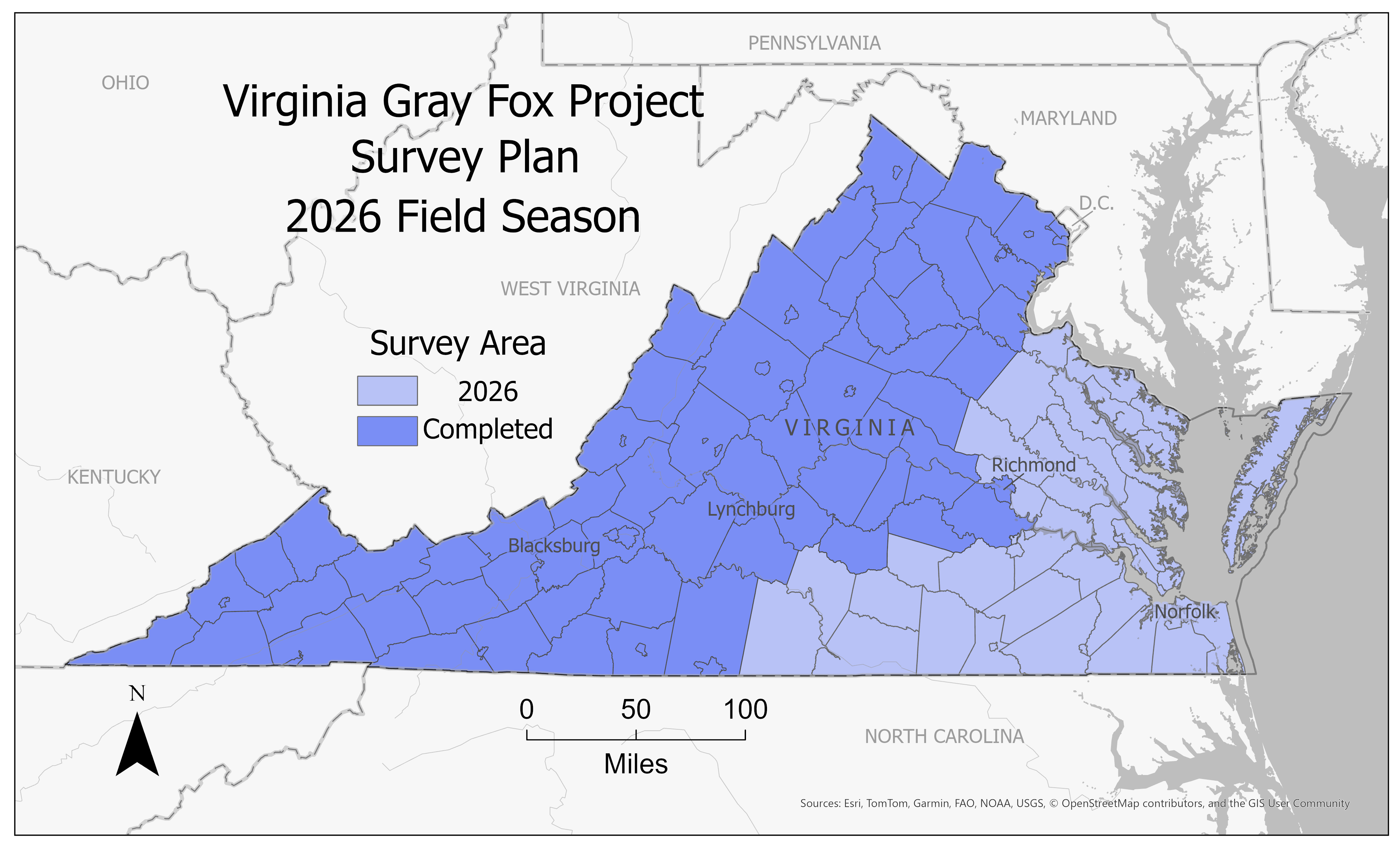 这个为期三年的项目将获得全州灰狐数量以及其他野生动物的数据。在 2024 中,研究人员重点研究了弗吉尼亚州的西部各县,在 425 个地点设置了项目摄像机,并由参与的土地所有者额外设置了 38 摄像机。在2025 ,研究小组以皮德蒙特地区为重点,在492 个地点设置了摄像头,另有71 个摄像头由参与的土地所有者设置。在2026 ,团队将覆盖皮德蒙特沿海计划区域中南部和东南部的其余各县(包括东海岸)。该项目希望这些地区的土地所有者参与进来。