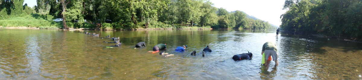 世界上任何其他地方的水生生物学家都没有机会在一个地方看到如此多的珍稀濒危物种,就像在弗吉尼亚州西南部阿巴拉契亚山脉的这条河流中一样。贻贝观察员会穿上潜水服和呼吸管,然后穿过河床寻找河底的贻贝。如果他们发现了某种鱼类,就会向在河中保持垂直、手持写字板的记录员喊出该物种。一些贻贝的长度将被测量,以帮助研究人员了解其种群的年龄结构和健康状况。