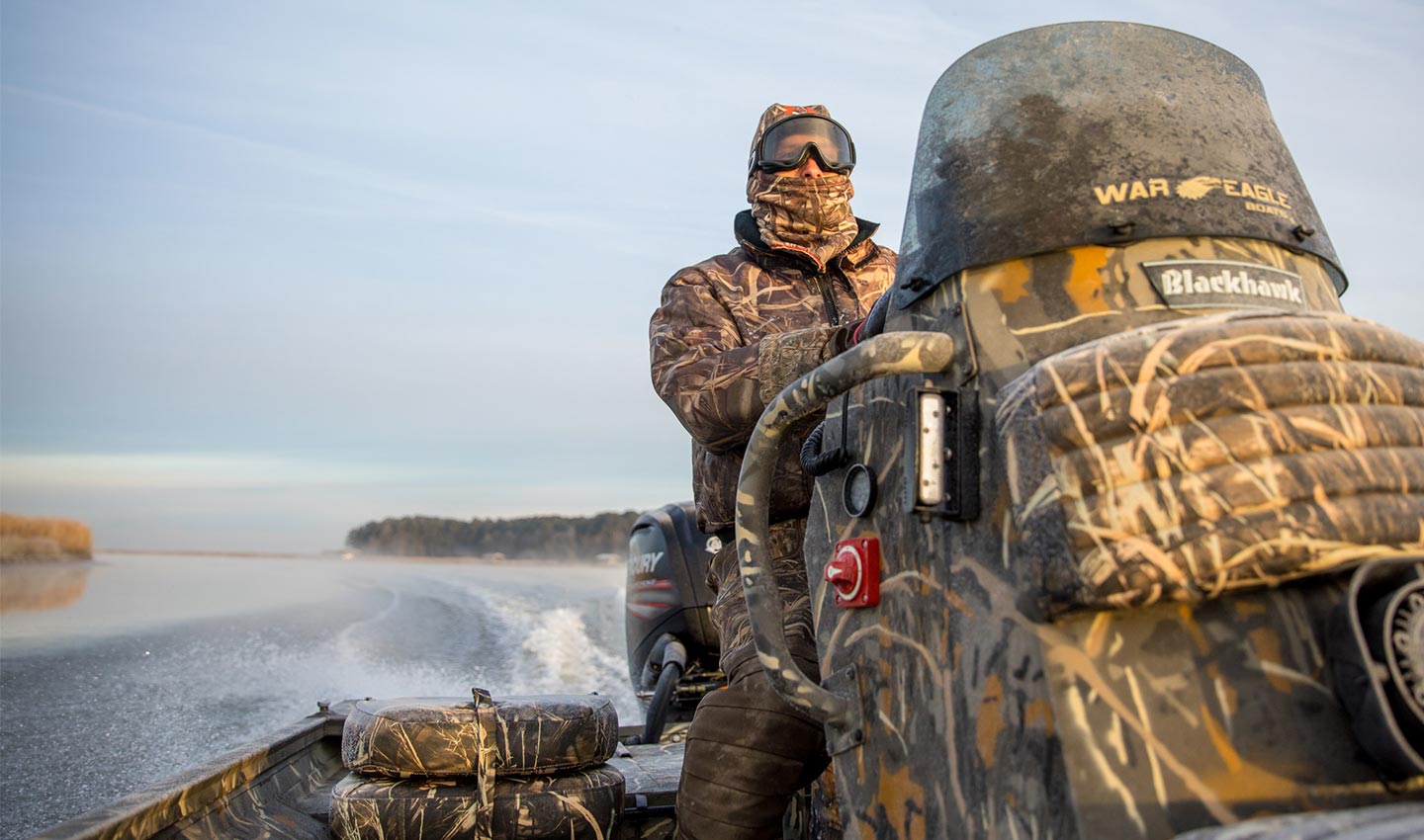 早上一小时后,我们驶入了主河道旁的一条小溪,在那里我们发现了四名猎人躲在一个漂浮的隐蔽处。当三声枪响时,我们离目标不到100码。我撞到了船头的甲板。显然他们没有看到我们。我搜寻了遮蔽处周围的天空,寻找鸟儿,但是没有看到。