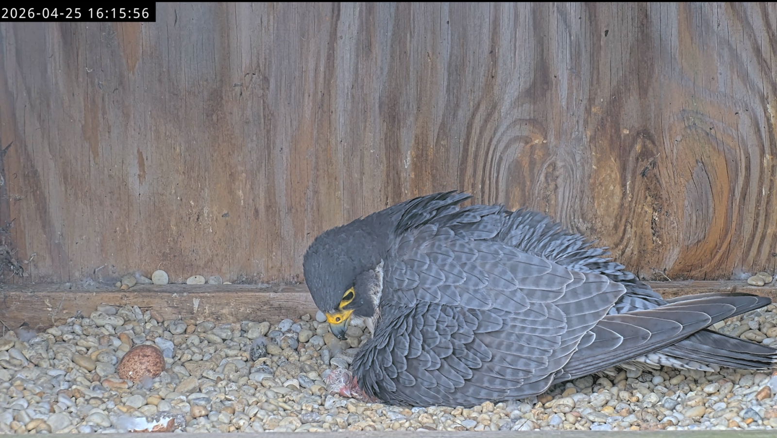 The male peregrine falcon, 59/BM, comes into the nest box for his turn to incubate the eggs.