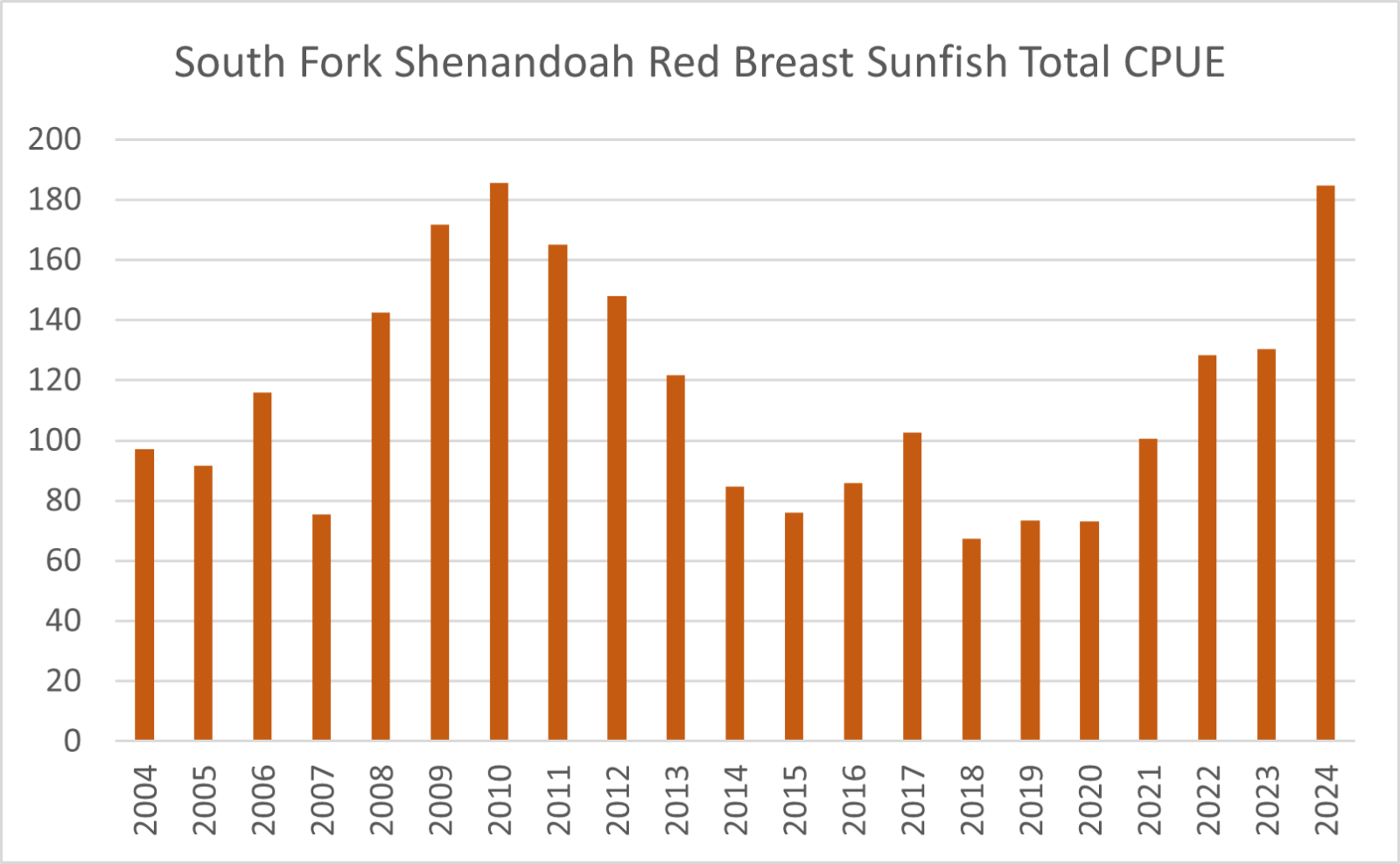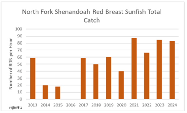 谢南多厄河的另一个成功案例是太阳鱼种群,特别是红胸太阳鱼。在经历了2014 - 2020的七年人口下降之后,人口数量已强劲反弹(图2 )。在过去三年中,我们观察到捕捞率高于长期平均水平,其中21 % 的捕捞鱼长度 > 6英寸。我们的捕获量是自我们开始采样南福克以来第二高的,因此钓鱼者应该可以轻松捕获大量的太阳鱼。