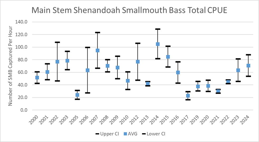 詹姆斯河上游发源于铁门附近的杰克逊河与考帕斯彻河交汇处,向下游流经约90英里到达林奇堡市。与前几年相比, 2024年电捕鱼捕获小嘴鲈鱼的捕获率有所增加。2021和2023的产卵量高于平均水平,导致小嘴鲈鱼数量增加,尺寸范围为7至10英寸。在秋季2024 、 1 、 504我们使用电捕鱼具捕获了小嘴鲈鱼,其中大约60 % 的鲈鱼被认为“可捕获尺寸”——尺寸为7英寸或更大。从捕获的幼年小嘴鲈鱼长度约为5英寸或更短来看, 2024产卵量似乎高于平均水平。