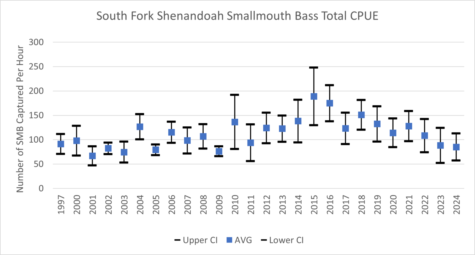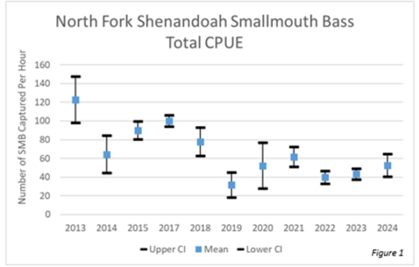 北福克谢南多厄河已经溃坝,但尚未完全溃坝。现在小嘴鲈鱼的总数可能不如几年前那么多,但在这条河上漂流一定不会令人失望。在我们2024春季木筏采样期间,我们在位于北叉上游、中游和下游的三个6英里浮标内以每小时52 . 7的速度采集了318小嘴鲈鱼(图1 )。与2023样本相比,我们的总捕获率略有增加,但仍低于每小时66的长期平均值。 8条鲈鱼。约有45 % 的小嘴鲈鱼长度为11英寸或更大,其中20 % 的长度超过14英寸。这是北福克的典型特征,只有2 % 的样本测量结果超过17英寸。由于水质清澈度较低,我们的样品略有偏差。我们的渔民发现许多优质鱼从木筏上逃走,逃脱了捕获。与去年的样本相比,优质鱼和适宜尺寸鱼的数量继续增加(图2 )。然而,总体数量低于平均水平,这让生物学家和垂钓者都感到沮丧。不幸的是,北叉的产卵成功率仍然很低,导致种群恢复滞后。在2018 ,谢南多厄河北叉经历了长期创纪录的洪水,这似乎对鱼类群落产生了负面影响(参见图1中2019样本期间总体捕获率的急剧下降)。部分民众仍在努力从此次事件中恢复过来。