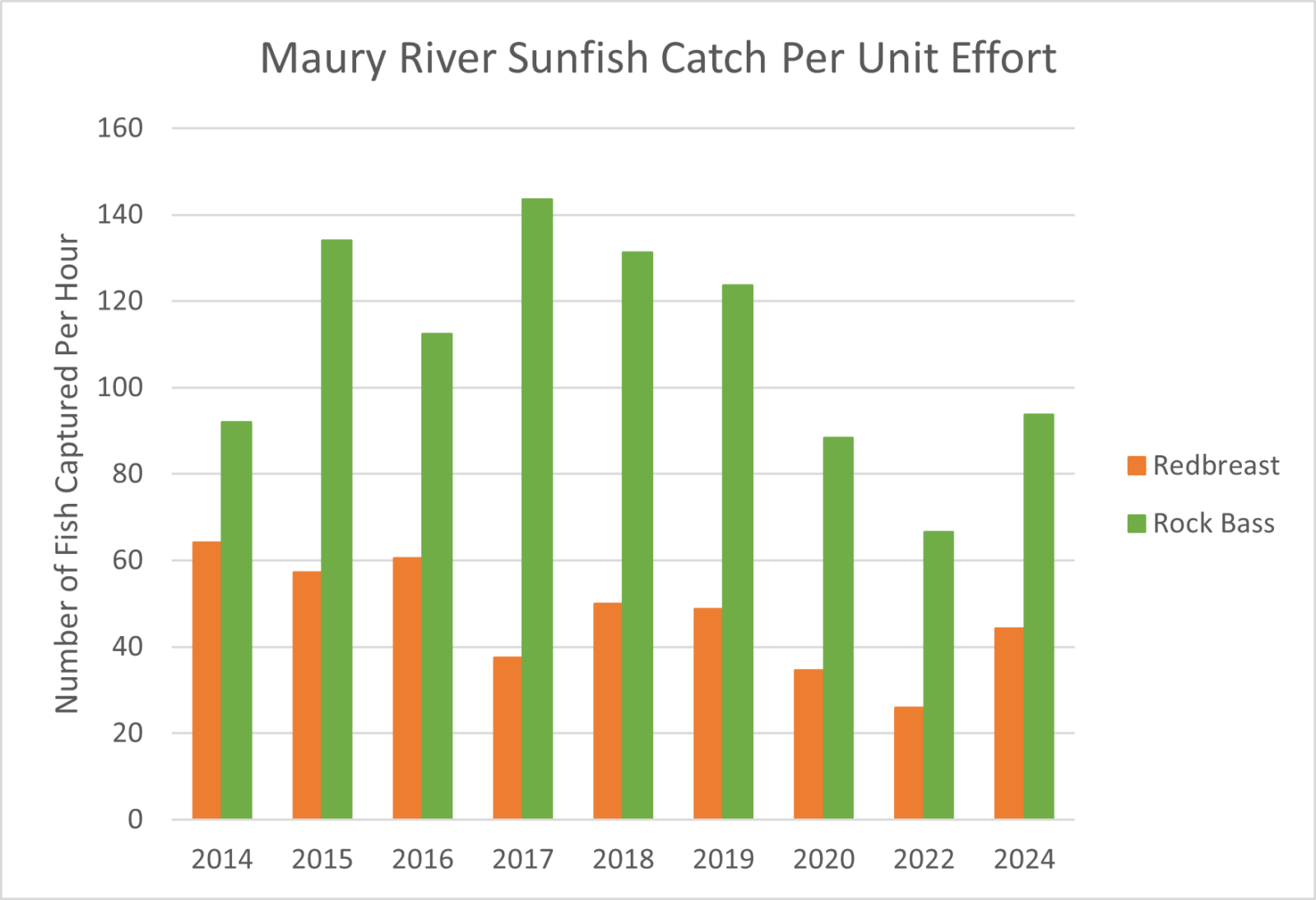 莫里河不仅仅为我们的钓鱼爱好者提供小嘴鲈鱼。岩鲈和红胸太阳鱼数量极其丰富,不容忽视。垂钓者可以捕获比红胸鱼更多的岩鲈,因为我们的太阳鱼比例通常为2 : 1岩鲈和红胸鱼太阳鱼。两个鱼群都非常健康,样本中有20 - 40 % 的鱼长度为6英寸以上。在2020和2022经历轻微下降之后, 2024种群数量也出现轻微回升(图2 )。