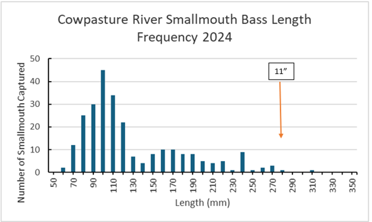 考帕斯彻河是联邦西部最美丽的河流之一。当水位适中时,钓鱼者可以捕获各种各样的鱼。2024年秋季,生物学家对四个地点进行了采样,收集了20物种。小嘴鲈鱼种群正在苦苦挣扎。与詹姆斯河类似,该河多年来一直遭受产卵困难的困扰。因此,系统中优质鱼(鱼长 > 11英寸)非常少(图1 )。