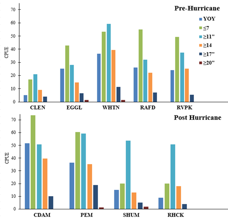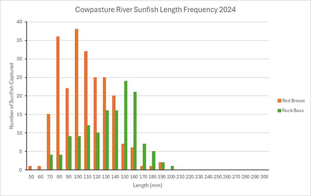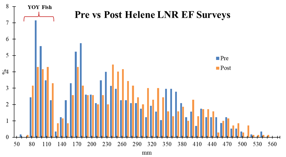 通过2024秋季电捕鱼调查在新河下游收集的鱼的长度频率图。第一个峰值表明,在飓风海伦之前和之后, 2024年生鱼类的数量都很多。