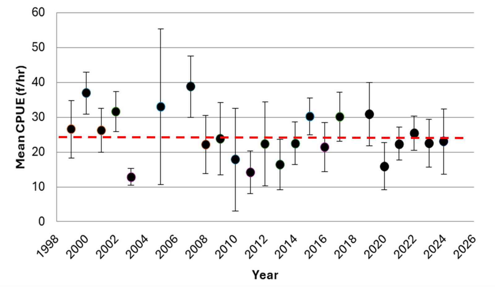就小嘴鲈鱼产量而言,莫里河是该州最稳定的河流之一。今年春天我们的捕获率略有下降,但这在很大程度上可以归因于异常低的水位。当水质清澈时,鱼往往会逃避捕获,并游向我们够不着的深水区。无论如何,我们的捕获率都在长期平均水平之内(图1 )。