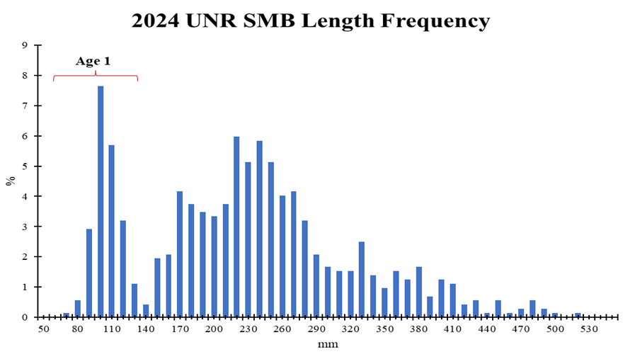 主干正在回归!在我们2024秋季采样期间,我们从三个地点捕获了230小嘴鲈鱼,观察到的捕获率为每小时71 。 1条鱼。该河的捕获率连续三年呈上升趋势(图1 )。约有37 % 的小嘴鲈鱼体长为11英寸或更大,其中20 % 的体长超过14英寸。百分之五的尺寸为17 + 英寸。主干道与南福克河类似,存在鱼类健康问题不稳定,且产卵成功率低。然而, 2022和2023的产卵量正好达到每小时12条鱼的长期平均值,这有助于提高我们的捕获率。我们今年的幼鱼捕获率2024低于长期平均水平,但仍有相当数量的幼鱼留在系统中。这对于渔业的未来来说是一个好兆头。总体而言,尽管数量较少,但我们观察到尺寸类别的良好混合。钓鱼者可以期待钓到大量长度为8 - 11英寸的槽前鱼,这是2022产卵良好的好处。还有各种优质鱼,长度从14到18 + 英寸不等。优质鱼的数量仍高于长期平均值,每小时16条鱼。