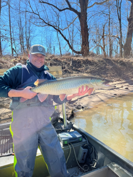不幸的是,扁头鲶鱼被意外或非法引入了这条河。生物学家在沃伦大坝至50公路桥之间发现了成年个体和野生产卵个体。平头鱼种群数量持续增加,特别是在主干道上游。捕获率已从2021首次发现时的每小时不到一条鱼增加到2024的每小时四条鱼。未来几年,生物学家将继续密切监测该种群数量。