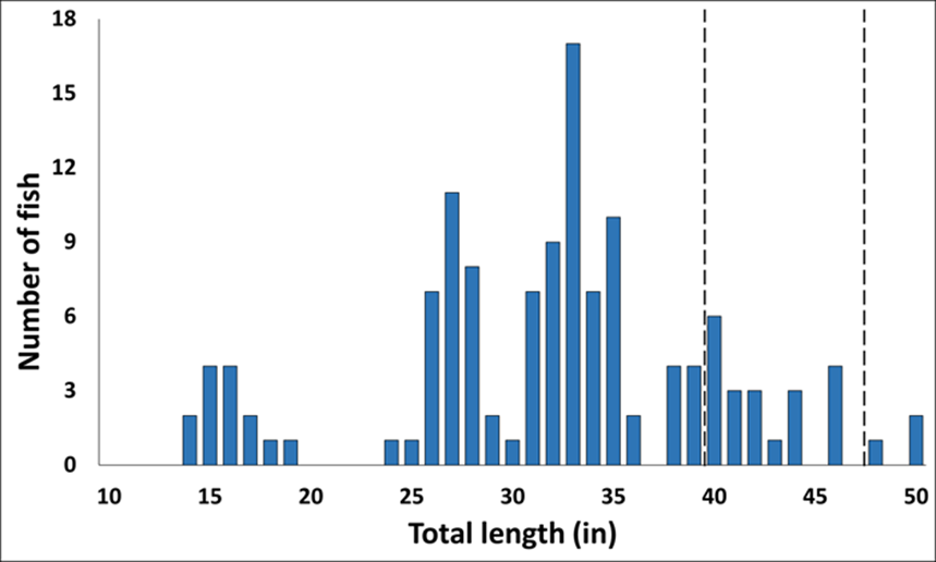 在2024年初的最后一次采样活动中,他们总共捕获了49条鱼,捕获速度为4 . 9条鱼,其中大部分鱼的长度在30 – 38英寸范围内。经过几年的低迷之后,持续的放养对种群数量产生了积极的影响。钓鱼者可以预期,未来几年内, 40以上英寸级别的鱼的数量将会增加。麝香鱼在弗吉尼亚州生长很快,雌性麝香鱼在五到六年内就能长到标准大小( 40英寸)。