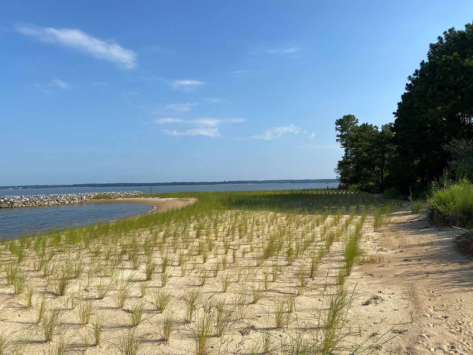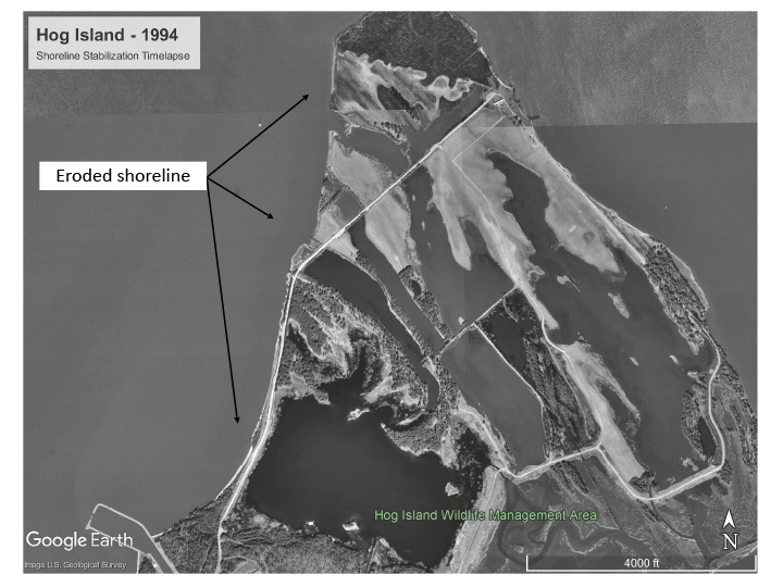 霍格岛实施海岸线保护的历史悠久。20 世纪2000年代初期,海滩养护(即添加沉积物和沙子)稳定了该地产的西南角。在2010世纪初期, 6西海岸修建了抛石防波堤和沙洲。2021 ,在 Ducks Unlimited、弗吉尼亚州自然保护和娱乐部 (DCR) 以及弗吉尼亚州环境基金会 - 詹姆斯河水质改善计划 (VEE JRWQIP) 的帮助下,最新的活海岸线项目完成了西海岸线所需的保护工作。该项目包括海滩草和河岸缓冲带植物种植、 7新的抛石防波堤的建造以及海滩养护以形成连岛沙洲。
