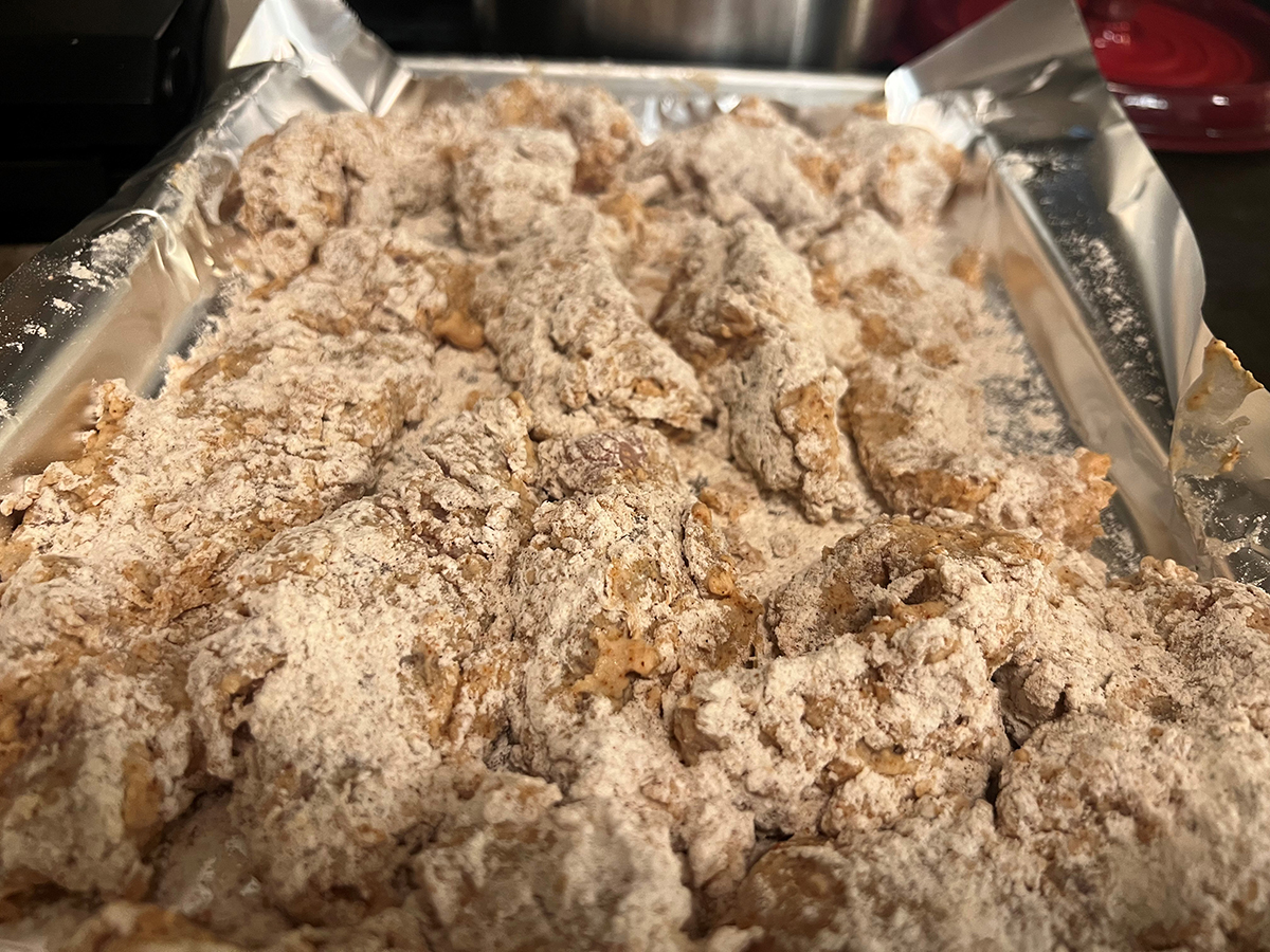我用火鸡胸肉做这顿饭,逆着纹理切片,去掉筋腱和多余的脂肪。切成薄片或块状(实际上,无论您喜欢哪种形状)。按照面包屑说明进行操作,但除此之外,这是一个简单的油炸过程。