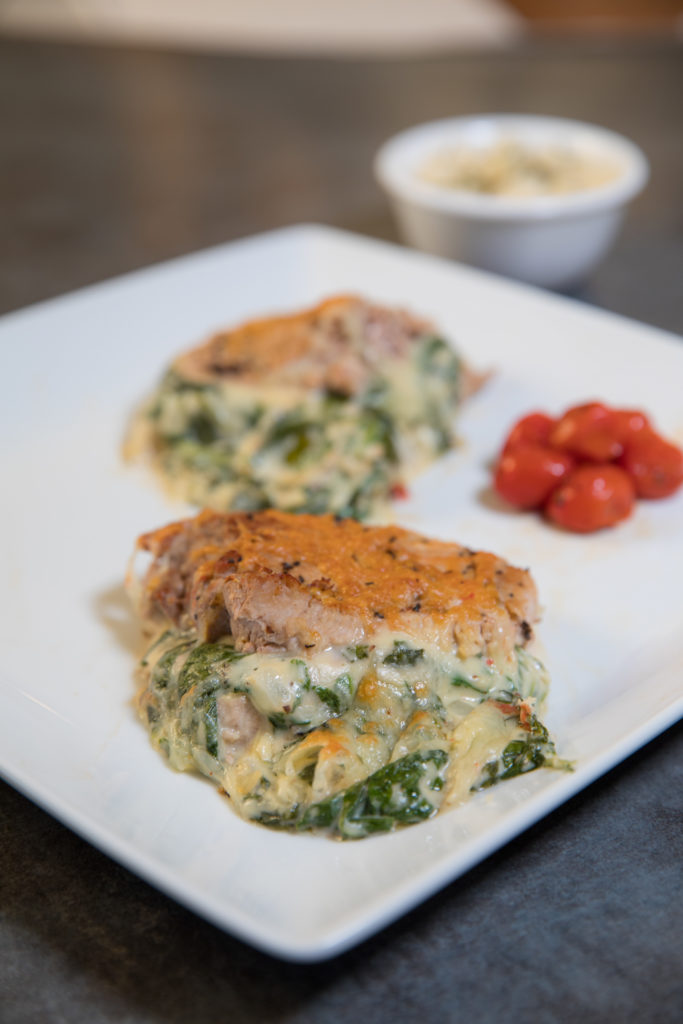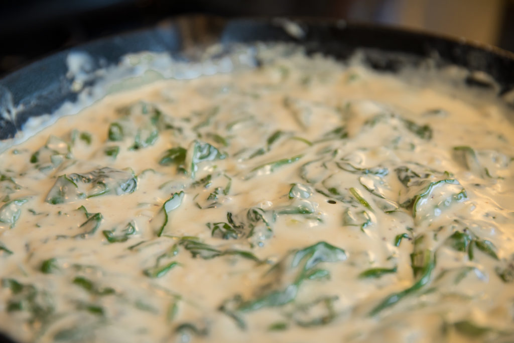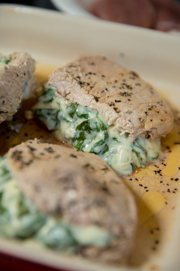 - 完成后,用勺子将奶油菠菜舀到锅中打开的火鸡胸肉上,然后合上胸肉,使奶油菠菜被胸肉覆盖。鸡胸肉应该被奶油菠菜“填满”。