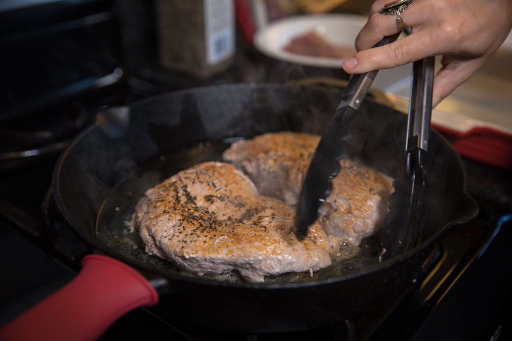 - 在煎锅中加热橄榄油,用中火煎鸡胸肉。煮熟后,放在烤箱安全的盘子里备用。
