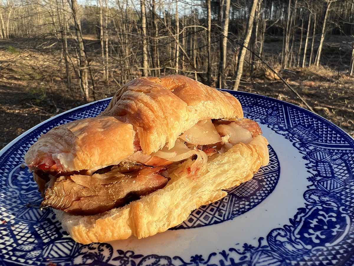 野火鸡肉质极佳,对于那些不敢尝试野味的人来说可能更容易接受,而这些三明治是享用野味的绝佳方式。首先,我使用 Hank Shaw 的食谱熏制野生火鸡胸肉:熏制无骨火鸡胸肉食谱 - 熏制野生火鸡胸肉 (honest-food.net)(这需要在冰箱中冷藏三天,所以请提前计划!)。火鸡和蔓越莓是经典的口味组合,因此您可以使用蔓越莓酱或果酱或蜜饯,但如果您记得在商店购买,我鼓励您使用越橘。它与蔓越莓类似,但在我看来要好一点。