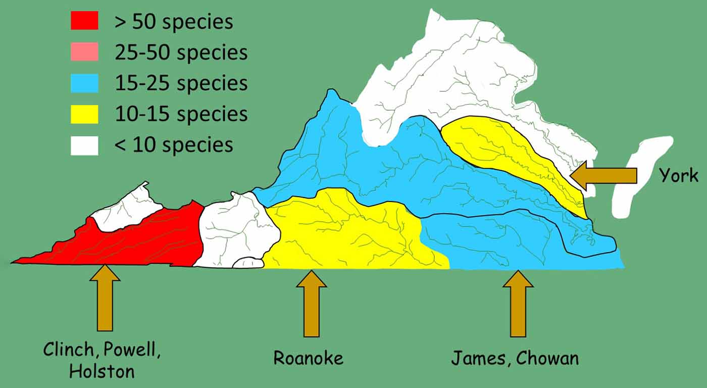 美国淡水贻贝的多样性是无与伦比的。全世界约有1 、 000种动物,其中美国历史上曾有304 ,约占世界动物总数的1 / 3 。与其他国家和大洲相比,例如非洲有96种,中国有60种,欧洲只有12种,美国的财富确实令人印象深刻。这种多样性的大部分分布在俄亥俄河、田纳西河、坎伯兰河和莫比尔河的东南流域。田纳西河流域是最具多样性的流域之一,拥有102物种,占该国动物群总数的近1 / 3 %!弗吉尼亚州之所以成为其中的一部分,是因为田纳西河的源头位于该州的西南部。田纳西河流域弗吉尼亚州部分包括霍尔斯顿河(北河、中河和南河)的鲍威尔河、克林奇河和福克斯河。在这些河流中,目前有超过45种贻贝,其中几种只有在田纳西州上游流域才能找到。
