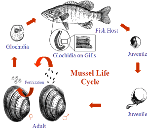 淡水贻贝的生命周期是动物世界中最复杂、最有趣的生命周期之一。与其他能够主动寻找配偶的动物不同,定居贻贝依靠河流进行繁殖。该过程始于雄性释放精子,而位于下游的雌性则通过其虹吸管将精子吸入。受精卵的数量从数100到数十万个不等,在其鳃内发育成为钩幼虫。一旦成熟,它们就会被释放到水柱中,开始其生命的第二阶段——附着在淡水鱼的鳃、鳍或鳞片上。此时,过程变得更加复杂,因为钩介幼虫不仅必须找到鱼,而且该鱼必须是少数几种特定鱼类之一,生命周期才能继续。如果钩介幼虫附着在正确的鱼类物种上,它就会进入鱼的组织中,并作为寄生虫经历短暂的寿命。