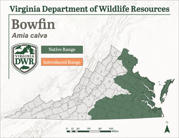 尺寸:在弗吉尼亚州,弓鳍鱼可以长到超过30英寸长,超过10磅重