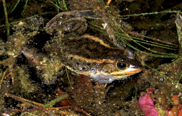 与其他真蛙相比,这是一种体型较小的青蛙。身体呈深褐色,背部有四条黄色或金褐色的纵向条纹。背外侧褶皱不存在。腹部呈黄色,带有深褐色或黑色斑点。