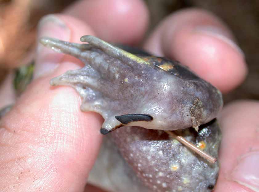 铲足动物因每只后脚(中间靠右)上各有一个黑色铲状附属物而得名,该附属物用于挖洞进入沙土或松散的土壤。大而突出的眼睛有垂直椭圆形的瞳孔。通常为棕色,有时为黄色或相当暗,经常有斑点,有两条浅黄色的背纹从眼睛延伸到背部。它们还具有小的甲状旁腺和少量疣。