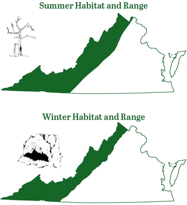 已知蝙蝠种群中有 95% 仅在15洞穴中冬眠。在弗吉尼亚州,人们在十二个不同的洞穴中发现了数量较少的印第安纳蝙蝠。自 20 世纪1970年代首次对印第安纳州蝙蝠数量进行调查以来,该州的蝙蝠数量一直在下降。
