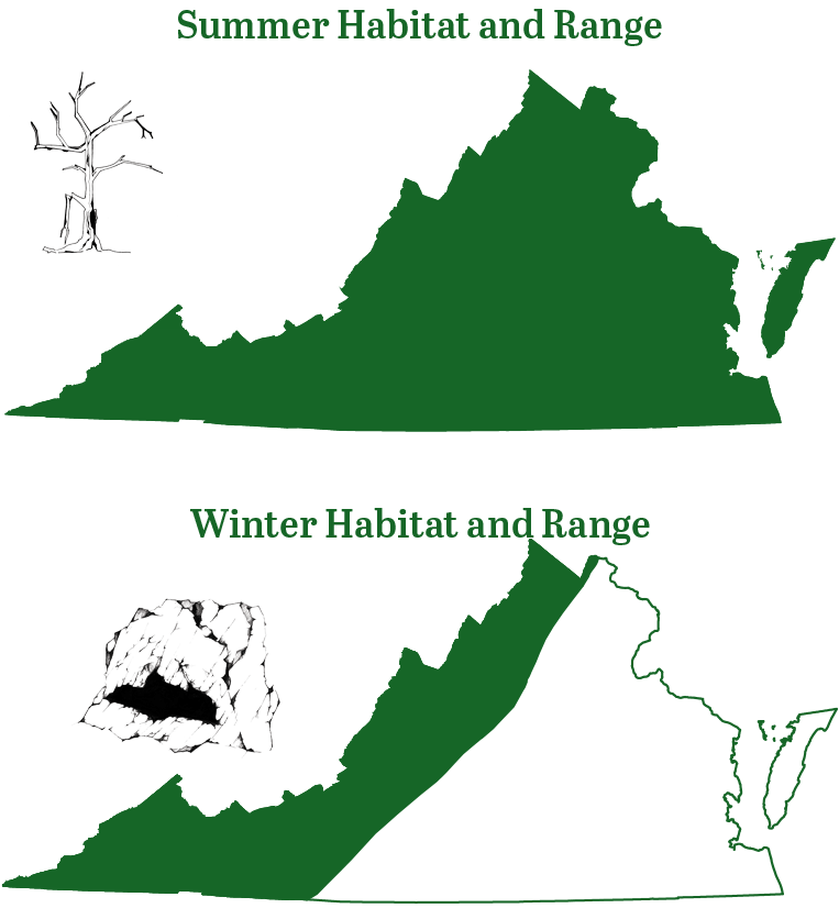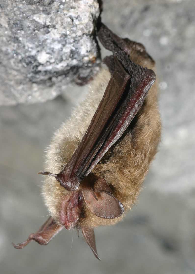 北长耳蝠冬季在洞穴中冬眠,但也曾在矿井和水坝等人工栖息地中发现过它们的踪影。这些蝙蝠喜欢在狭窄的缝隙和偏僻的小地方冬眠,但它们也可能出现在空旷的地方。我们最常观察到它们单独悬挂,或者两三只蝙蝠成群挤在一个小缝隙中。此外,它们还会与其他物种(如小棕蝠和印第安纳蝙蝠)混合群冬眠。
