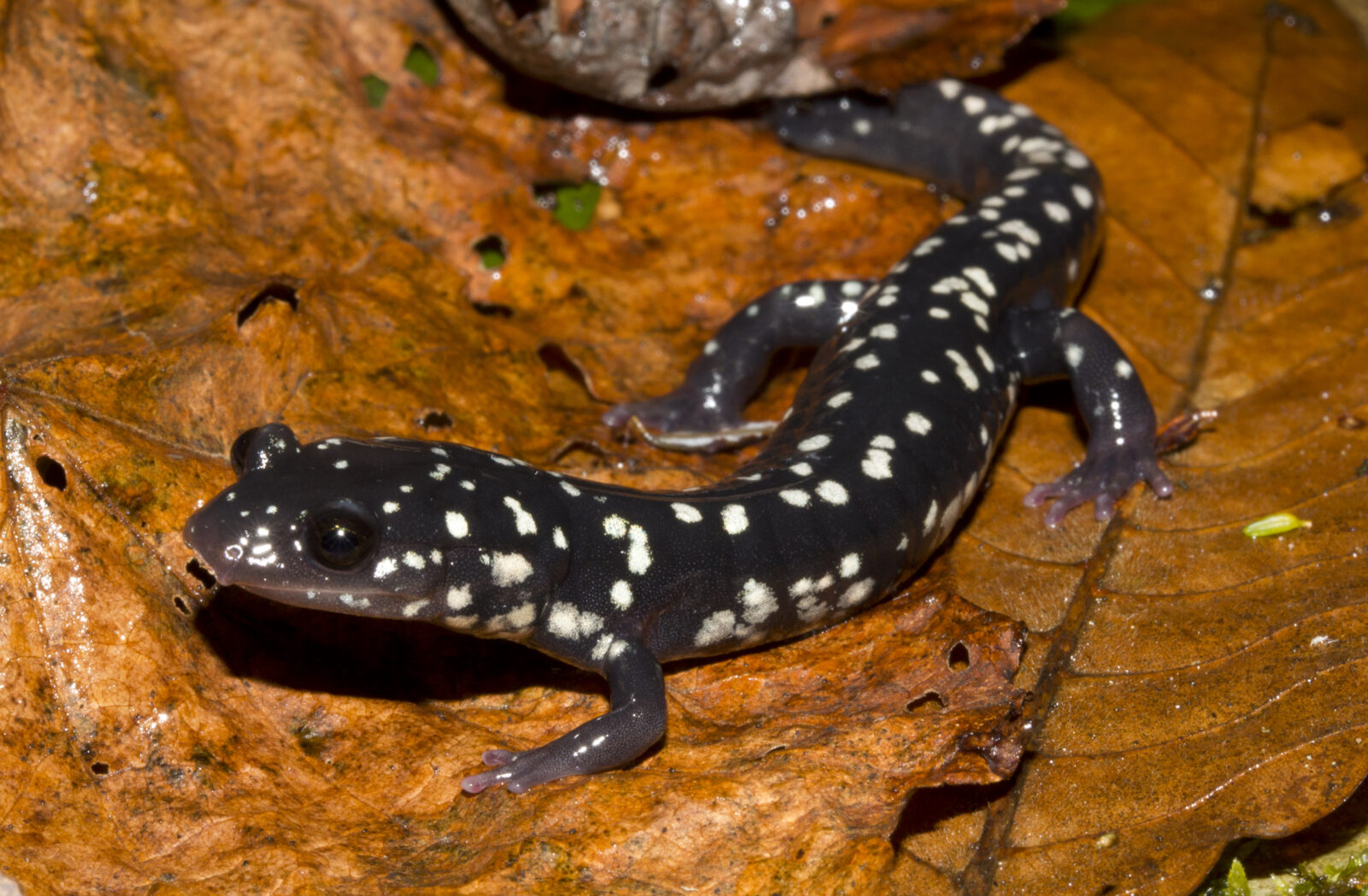 身体呈黑色至深蓝黑色,带有许多白色至银白色的斑点。身体旁边可能会出现较大的斑点。腹部呈灰黑色,无斑纹。性成熟的雄性下巴下方有明显的圆形精神腺。