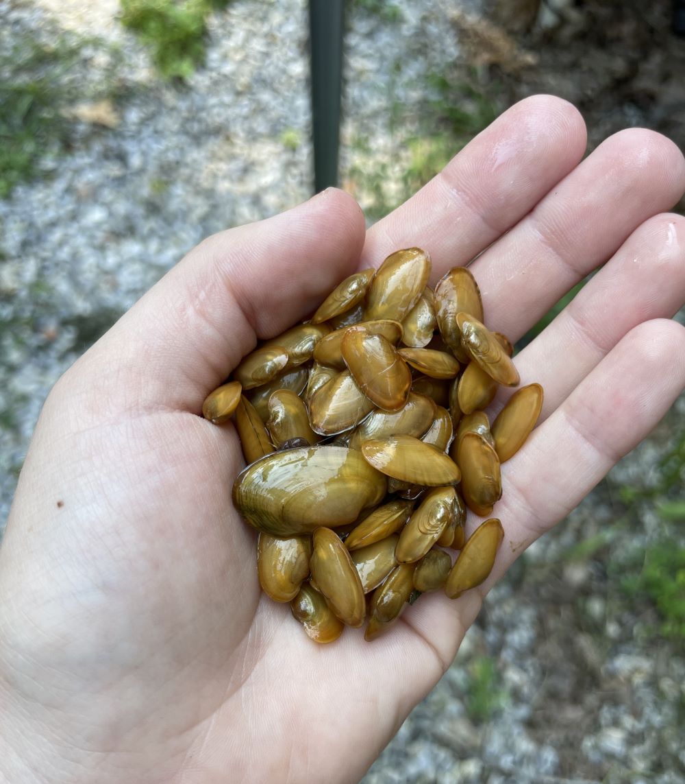 在年度贻贝调查中测量到的一只雉贝。摄影:©Kayla Howard-DWR