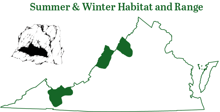 弗吉尼亚大耳蝙蝠仅在少数几个县的洞穴中全年可见,其越冬地点通常与夏季产房或单身栖息地不同。