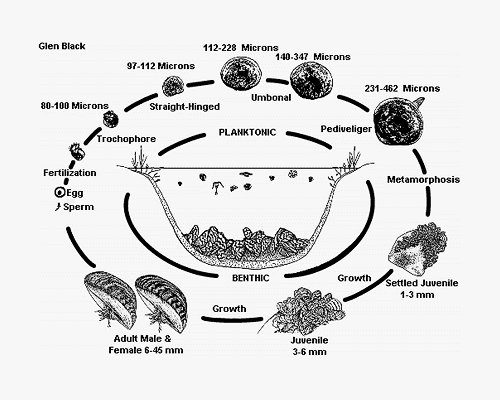 斑马贻贝是淡水双壳贝类(蛤蜊的亲戚),因其壳上交替出现的波浪状深色(黑色/棕色/绿色)和浅色(黄色、乳白色、白色)条纹而得名,这些条纹各不相同或可能不存在。成虫呈 D 形,通常为拇指指甲大小,但最大尺寸可达约两英寸。虽然这些双壳类动物的寿命相对较短(通常为2 – 3年),但它们的繁殖能力极其强,这有助于它们迅速而大量地扩散。一只成年雌性斑马贻贝每个生殖周期可产下约30 、 000 – 40 、 000颗卵,每年可产下多达1百万颗卵。自由游动的微小幼虫,称为面盘幼虫,将在水中漂流数周,然后栖息在它们能找到的任何坚硬表面上。斑马贻贝还能忍受各种各样的环境条件,成年贻贝甚至可以在离水的情况下存活约7天。与其他淡水双壳类动物不同,斑马贻贝能够利用其足丝附着在表面(见图),并形成类似于牡蛎床的大簇。每平方米人口密度超过100 、 000人的现象并不罕见,有些甚至高达每平方米1万人。(参见斑马贻贝的生命周期)。